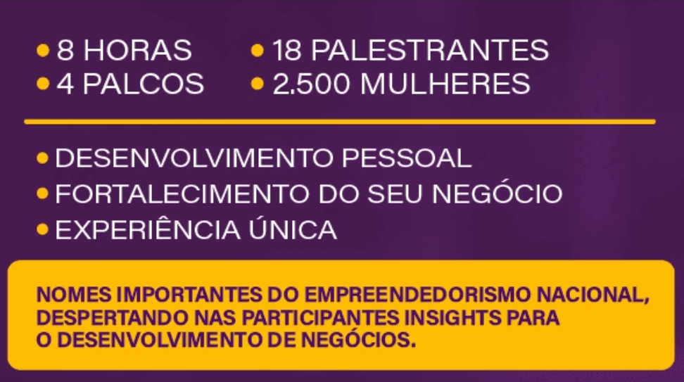 Evento de desenvolvimento pessoal, fortalecimento do seu negócio, experiências únicas, entretenimentos de qualidade e muito networking. Será 8 horas de evento, com 4 palcos, 18 palestrantes e com a presença de 2.500 mulheres empreendedoras.